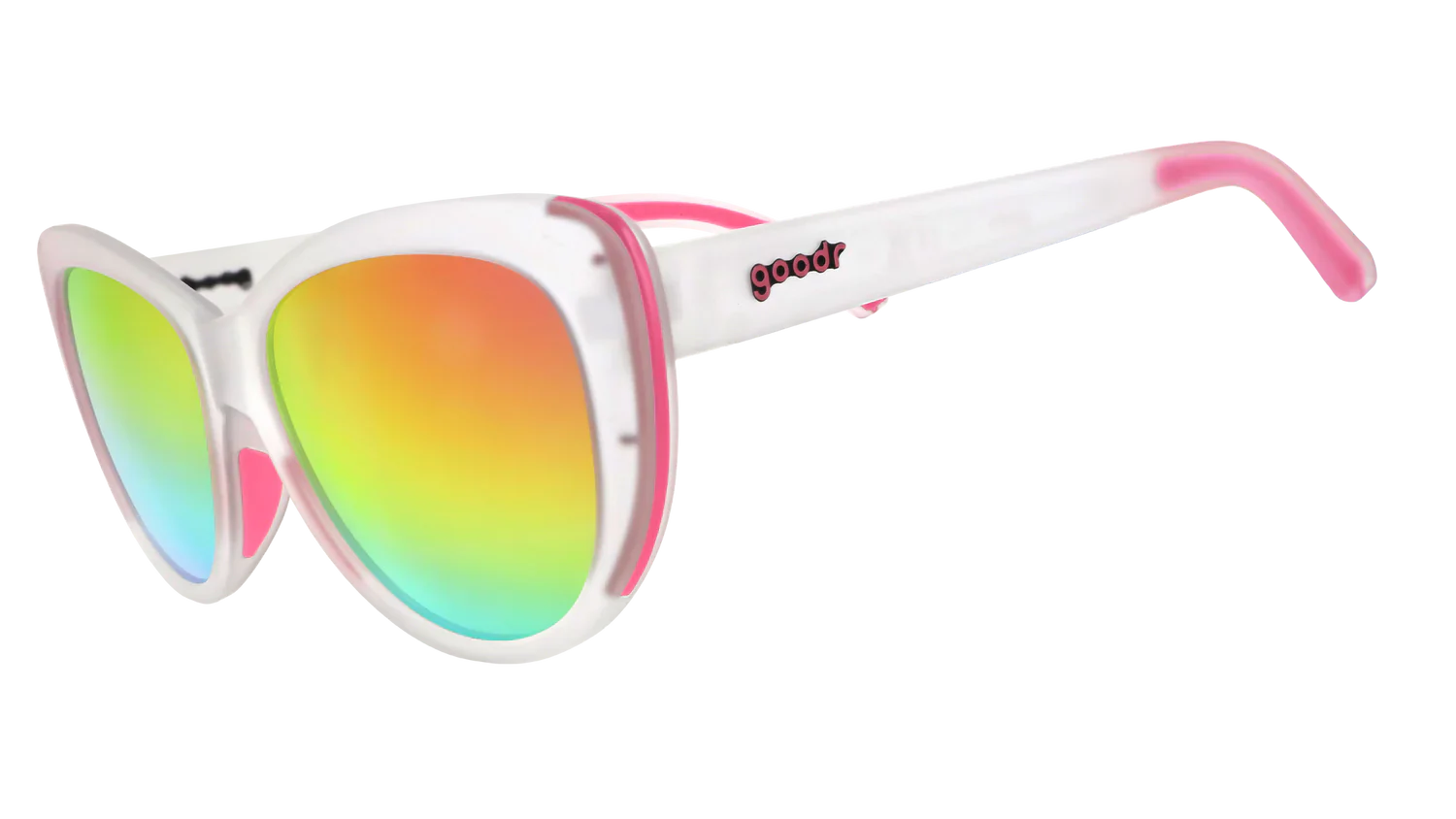 Trasforma ogni arcobaleno in una runway! Questi occhiali da sole cat-eye trasparenti con lenti riflettenti arcobaleno e accenti rosa vi trasporteranno magicamente in una caleidoscopica sfilata di alta moda nel cielo. (Ok, era una bugia, ma sono favolosi).