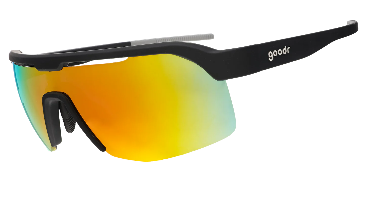 Questi occhiali da sole neri con montatura a mezza montatura e lenti riflettenti arancione bruciato non scivoleranno né rimbalzeranno quando farete uno spike e seguirete prontamente una leggendaria danza della vittoria nella endzone che può essere descritta solo come un twerkout.